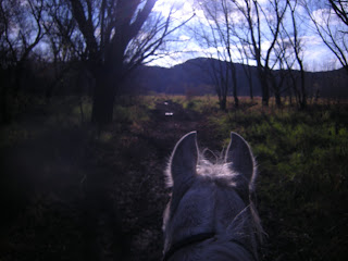 Red was still fully tacked last time I saw him, meaning that the only saddle I had to take Rhio out in is the one I've been trying to sell forever, the one that no longer fits him. I rummaged around for saddle bags and filled one with bandage materials and a sharp knife, another with carrots and some water for me. I tied a rump rug and a halter and lead on the back of the saddle. My hip protested a bit as I mounted, but it soon limbered up and we set off to retrace our steps from yesterday. I left the "Lost Horse" sign for G to put up at the end of the driveway, and the plan would be for her to follow on Paco in about an hour, going in to the trail on the second route, and meeting up with me.
